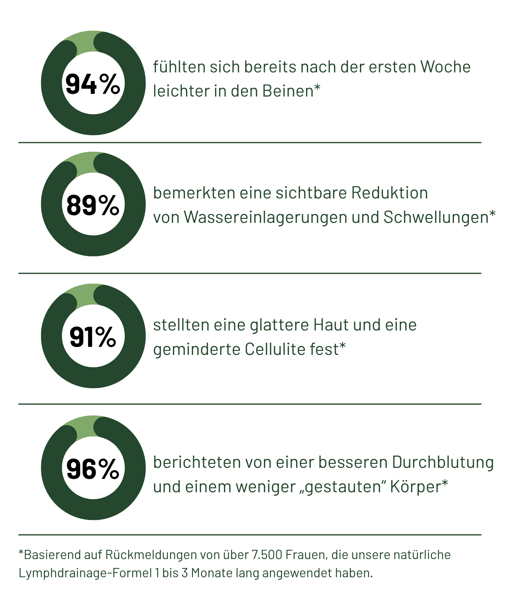 Viele Anwenderinnen berichten bereits in den ersten Tagen von einem Gefühl der Leichtigkeit. Für sichtbare Ergebnisse – weniger geschwollene Beine, straffere Haut, weniger wässrige Cellulite – wird eine Kur von 3 bis 6 Wochen empfohlen. Die Wirkung verstärkt sich mit der Regelmäßigkeit der Einnahme.