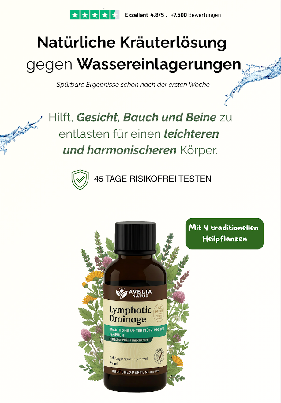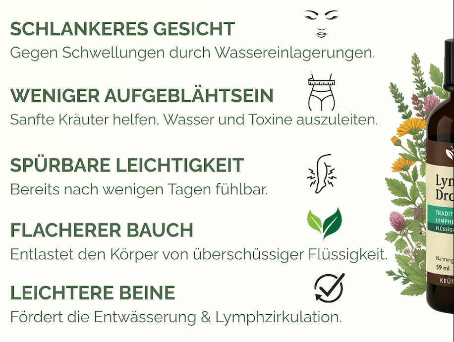 Unsere flüssige Formel stimuliert das Lymphsystem – einen oft vernachlässigten, aber entscheidenden Mechanismus zur Ausscheidung von Toxinen, überschüssigem Wasser und zur Reduzierung von Schwellungen. Pflanzen wie Kletten-Labkraut fördern auf natürliche Weise die Drainage und regen den Lymphfluss an – für eine leichtere, ausgeglichenere Silhouette von innen heraus.